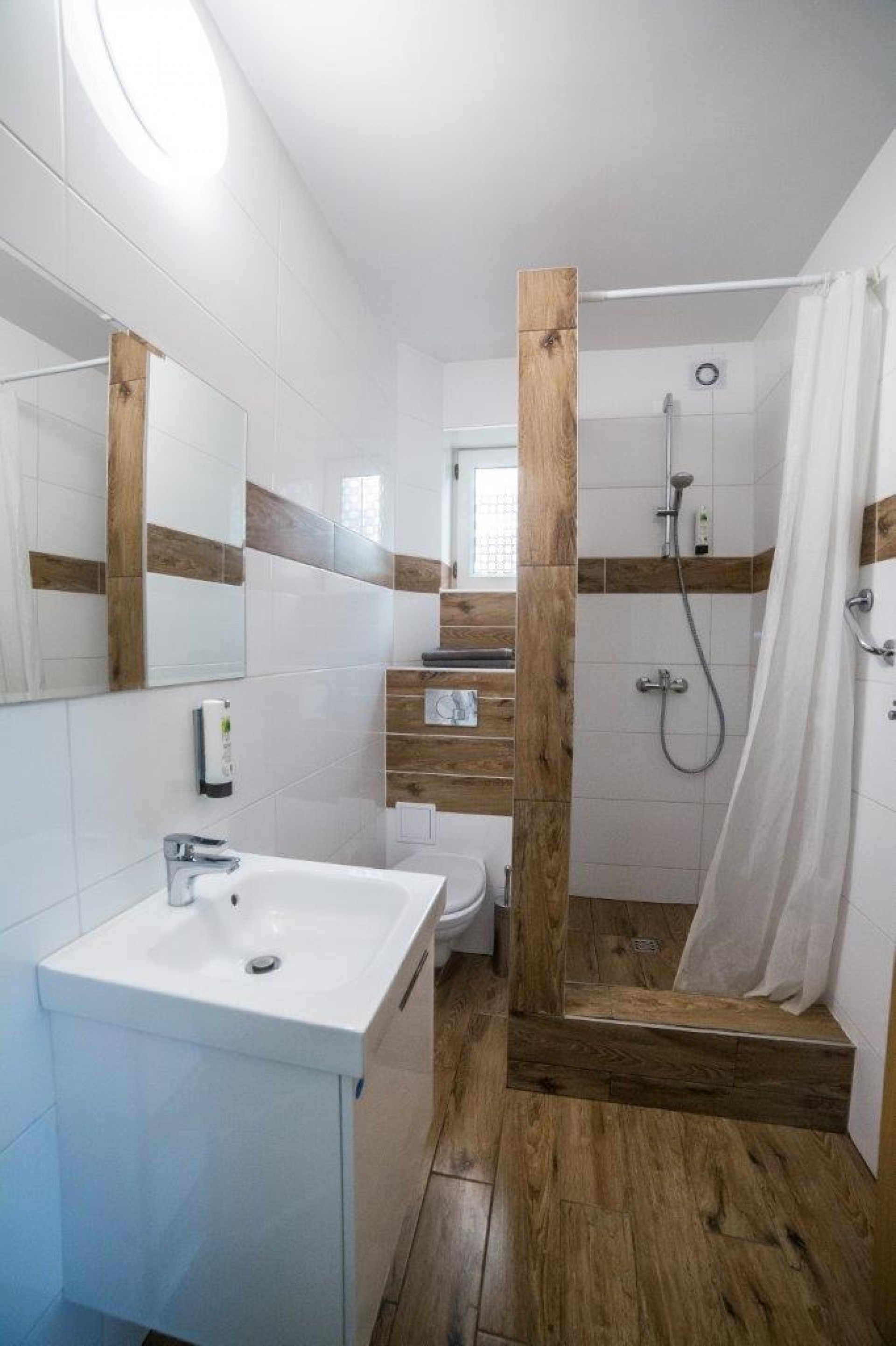 W pokoju znajduje się łazienka z prysznicem oraz TV LED, mały aneks kuchenny (kuchenka mikrofalowa, czajnik bezprzewodowy, lodówka i zastawa stołowa, sztućce, deska do krojenia, miska).
