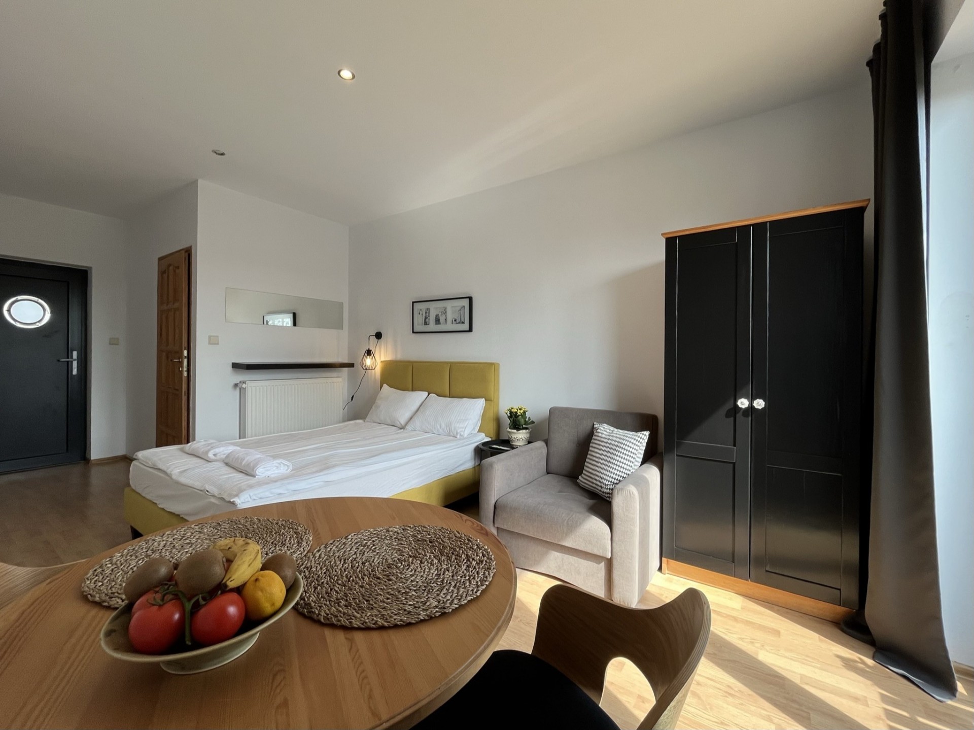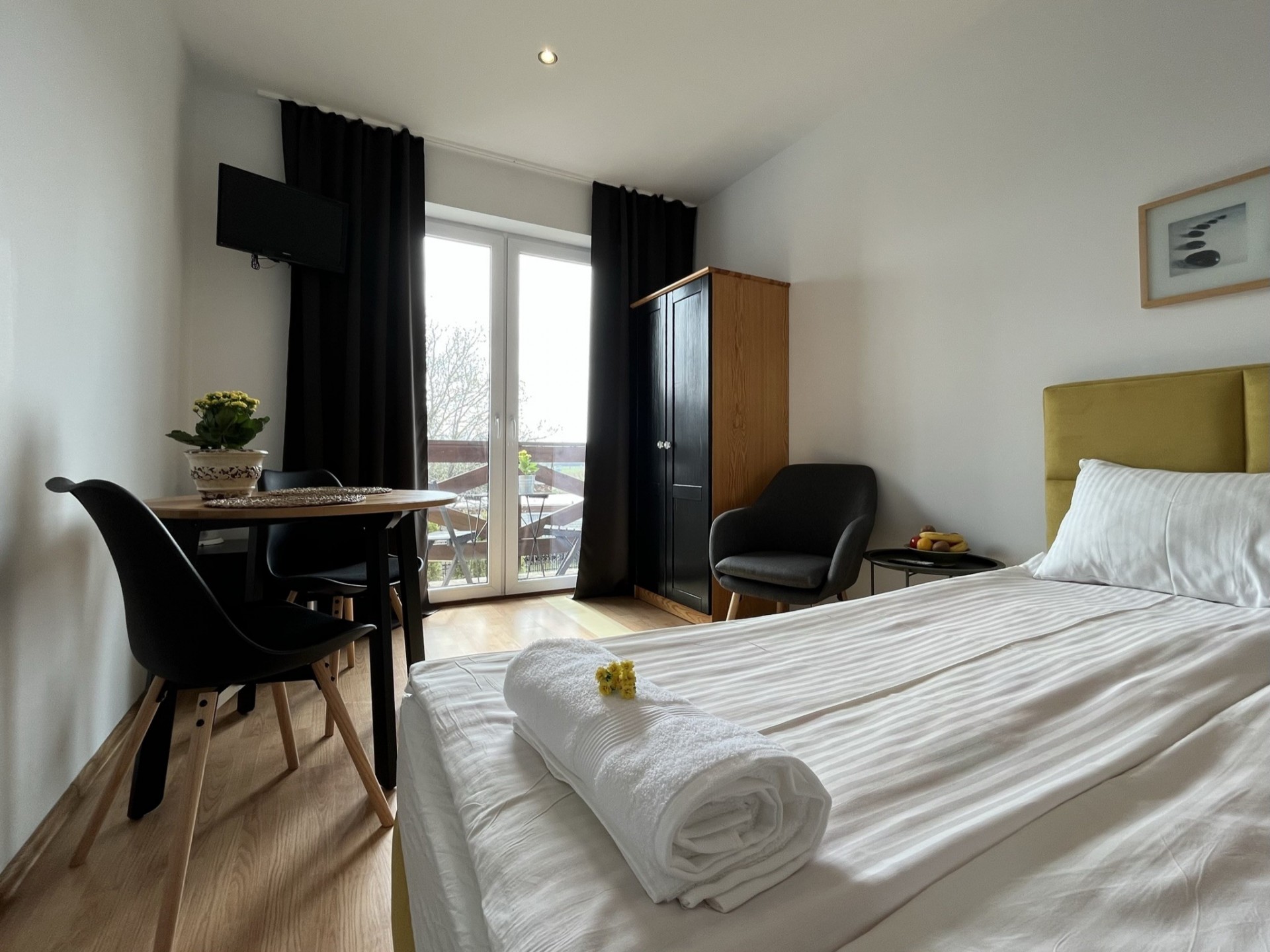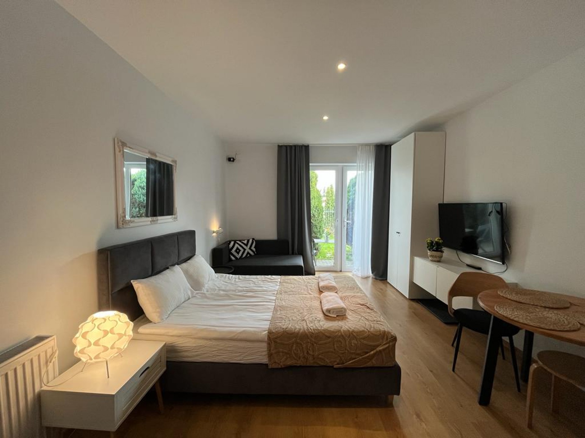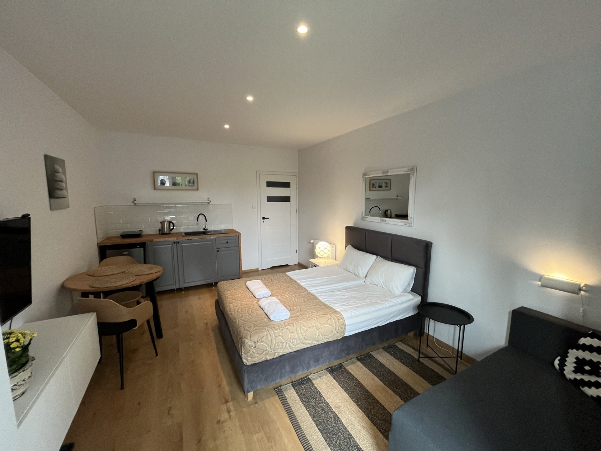 Apartamenty składają się z pokoju dziennego i z sypialni oraz każdy apartament wyposażony jest w aneks kuchenny.
