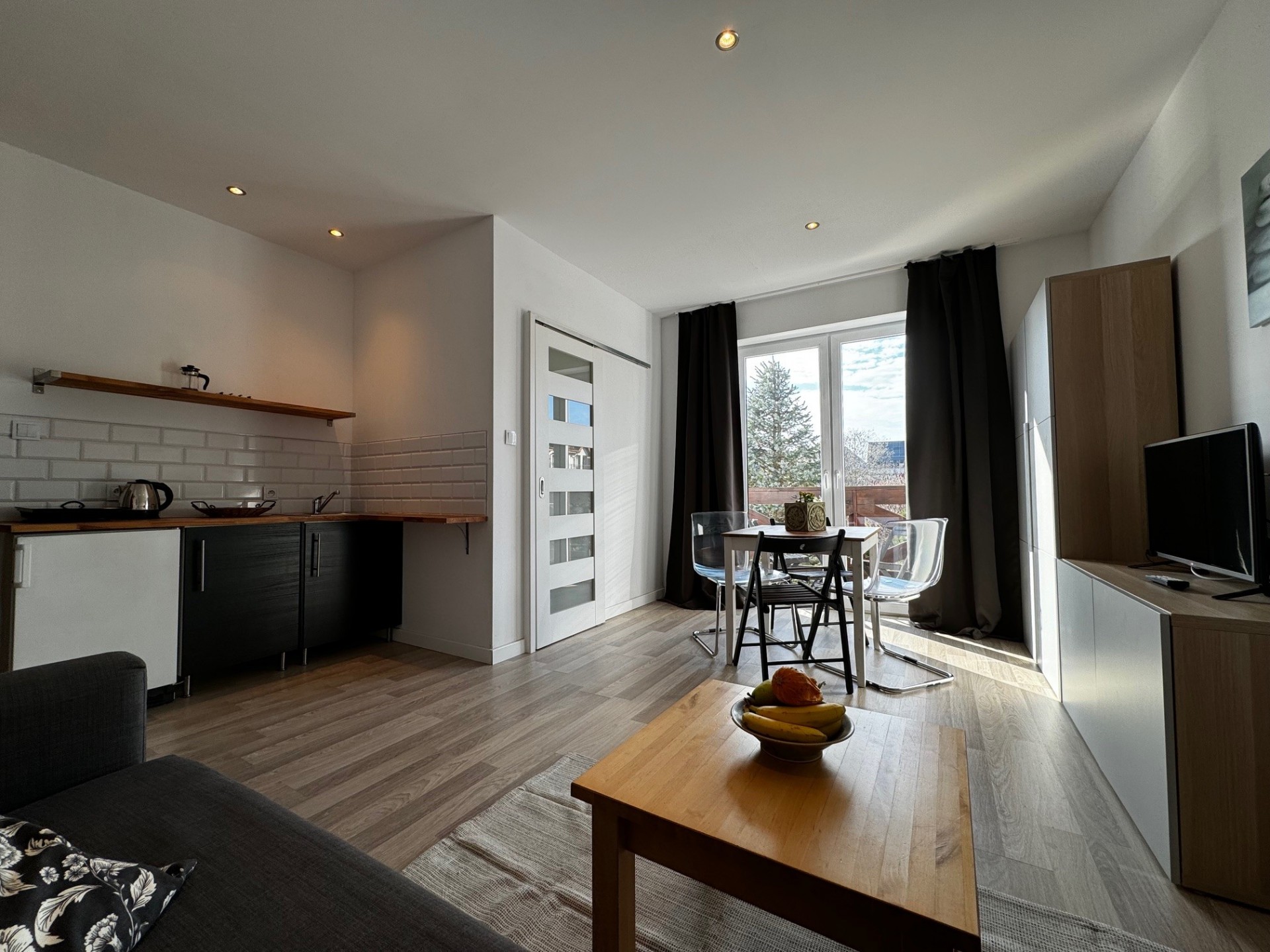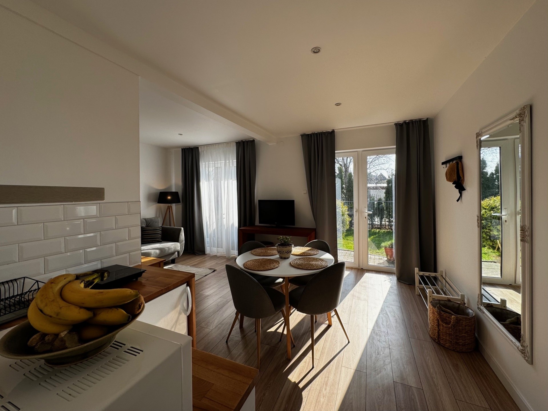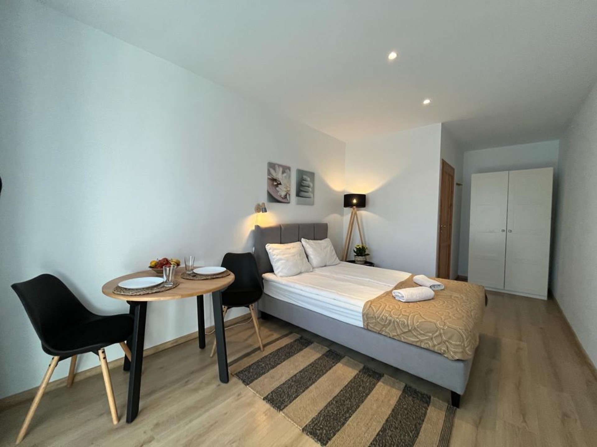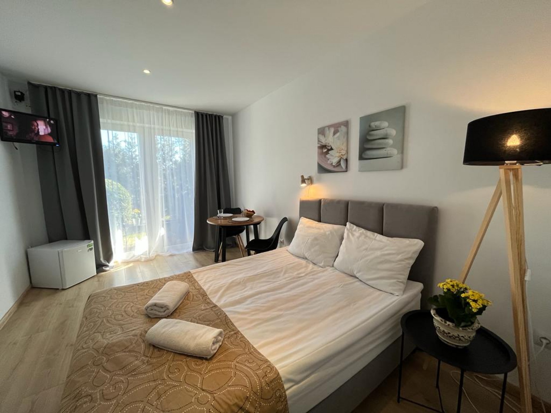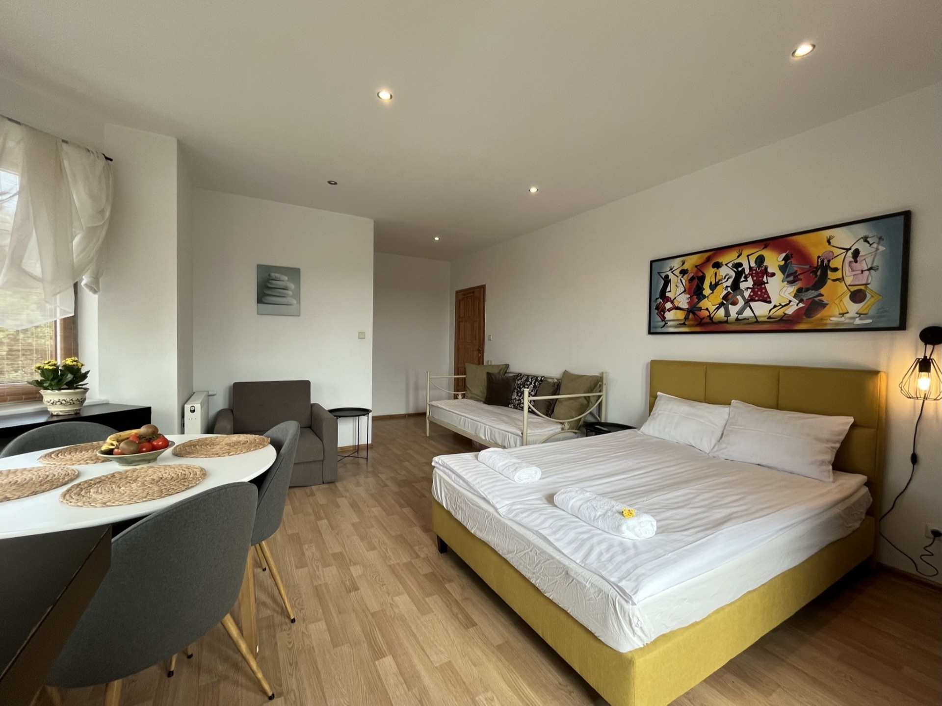 Apartamenty składają się z pokoju dziennego i z sypialni oraz każdy apartament wyposażony jest w aneks kuchenny.