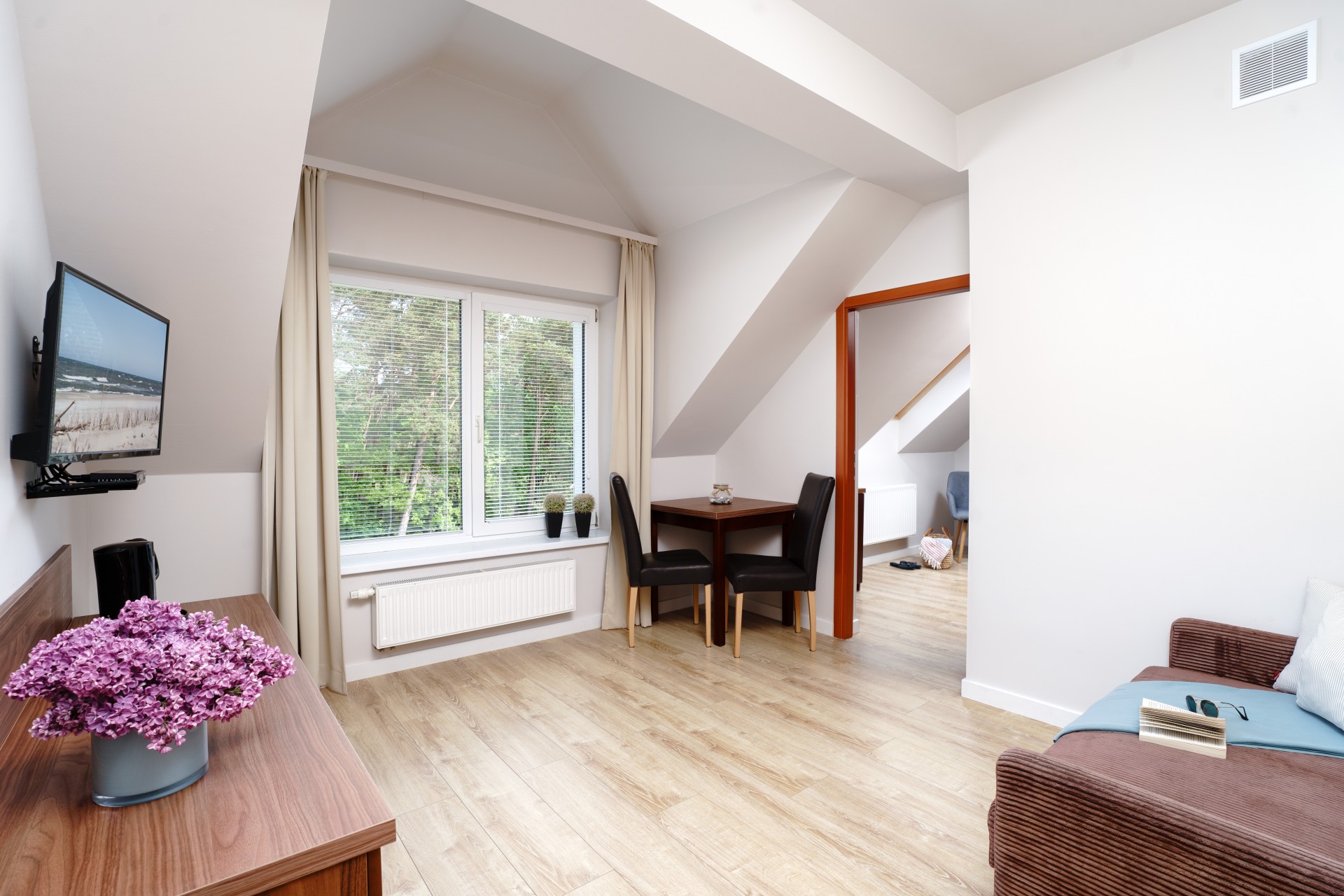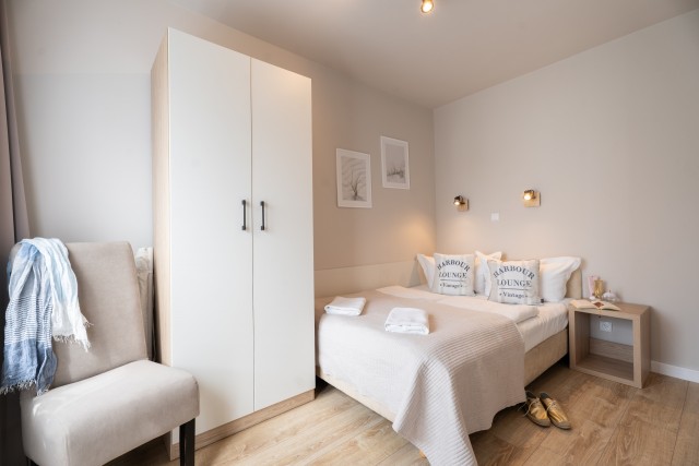 Oferujemy Państwu również apartament na parterze 3 - 4 osobowy składający się z sypialni, łazienki oraz pokoju dziennego z aneksem kuchennym.
