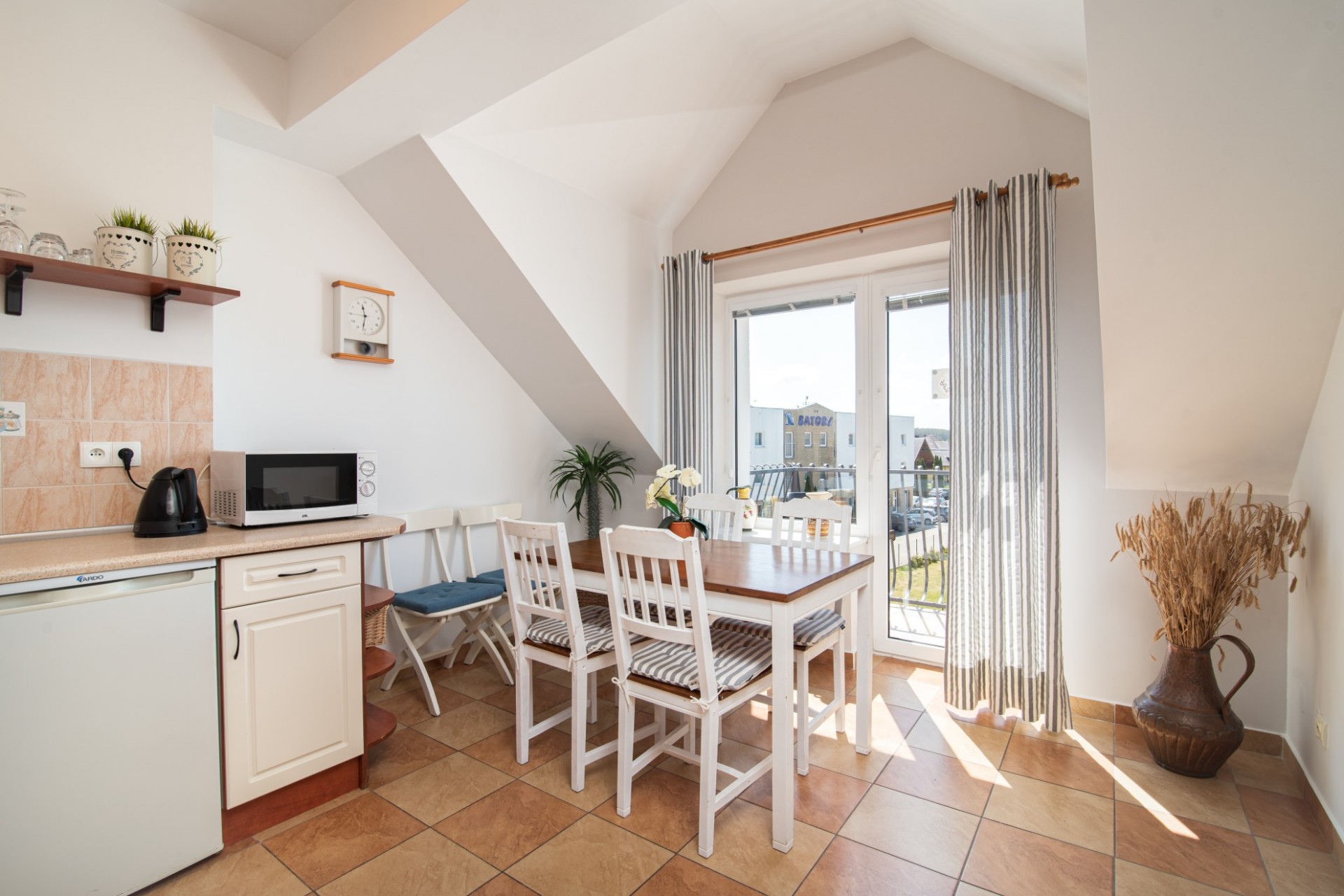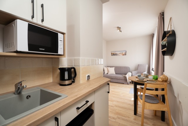 Proponujemy Państwu 3 apartamenty 4 osobowe, w tym jeden z balkonem. Apartamenty składają się z sypialni, pokoju dziennego i łazienki. W każdym apartamencie, znajduje się lodówka i czajnik bezprzewodowy. Dla trzech apartamentów, przeznaczona jest jedna w pełni wyposażona kuchnia. Apartamenty znajdują się na drugim piętrze.
